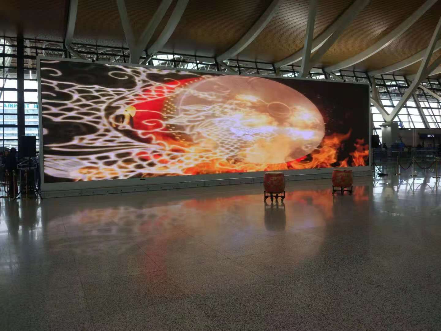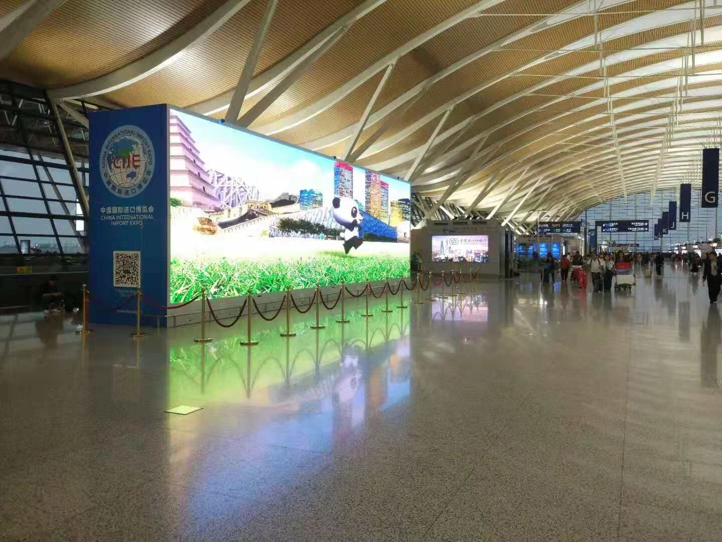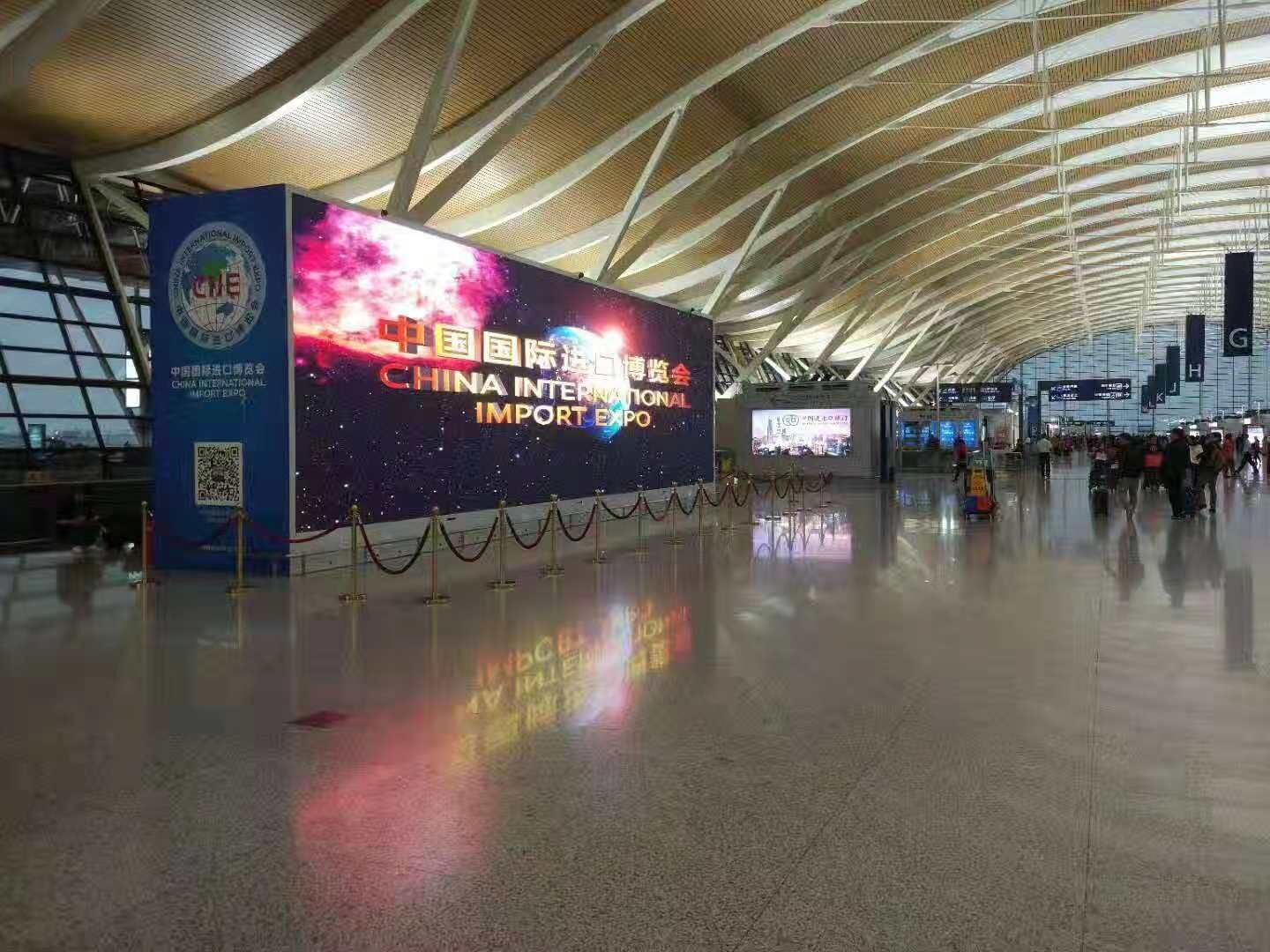 As the first China International Import Expo (CIIE) is around the corner, a 4.5-meter-high and15-meter-long LED screen showing promotional videos for the event was erected inthe Departures Area of Pudong International Airport’s (PVG) T2, on Oct 23.