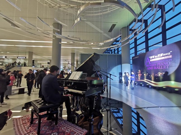 A special performance entitled A Conversation between Piano and Ballet brings passengers both auditory and visual enjoyment through "dancing musical poems" on Dec 20. [Photo by Wang Bingyi/Shanghai Airport Authority]