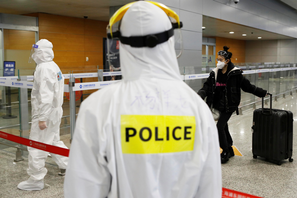 A police officer in a protective suit keeps watch on inbound travellers at Shanghai Pudong International Airport following a global outbreak of coronavirus disease (COVID-19), in Shanghai, March 20, 2020. [Photo/Agencies]