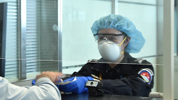A passenger holding his second-generation ID card is getting document verification without face-to-face contact with security staffs. [Photo/ Shanghai Airport Authority]