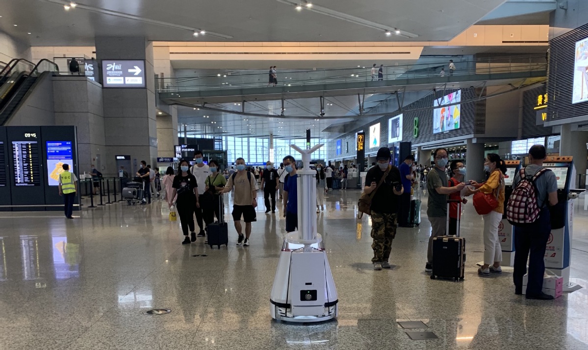 "When passengers enter the airport, they will find a disinfection mat for their shoes. Public areas and seats have been sprayed with an antibacterial coating, and will be disinfected every six hours. Free liquid disinfection soap is also available at every corner of the airport's two terminals, and a robot named Hongbao is moving around to disinfect up to 10,000 square meters of public space every day," said Xie Fang, deputy general manager in charge of operations at the Shanghai Airport Authority.