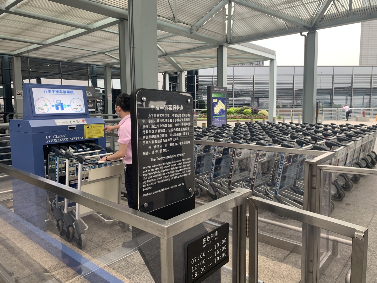 The airport has set aside an area for trolleys' disinfection before usage. [Photo by Wang Ying/chinadaily.com.cn]