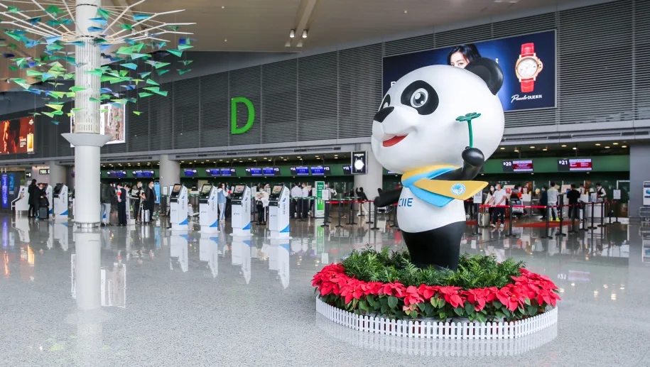 The Pudong airport has set up many points highlighting CIIE elements in Terminal 2, which is the busiest terminal. Passengers can take WeChat Moments photos against the backgrounds. The airport has also organized traditional Chinese cultural performances to promote the expo.