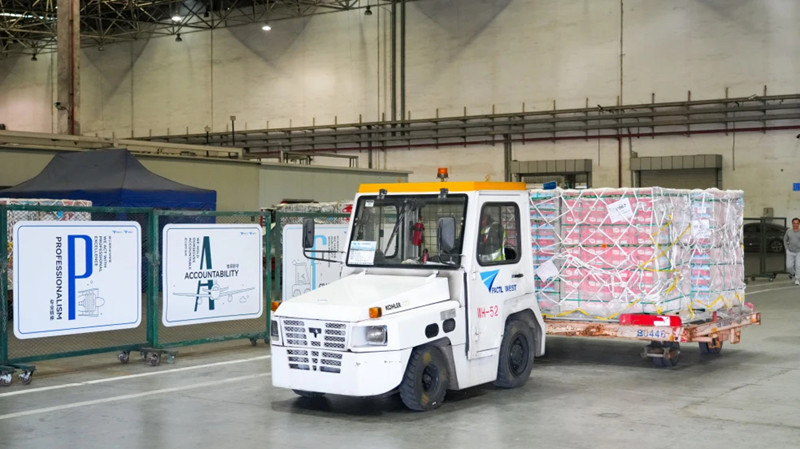 At Shanghai airport's warehouse, a utility vehicle transports wrapped cargo beside signs emphasizing professionalism and accountability. [Photo/WeChat account of AVINEX]