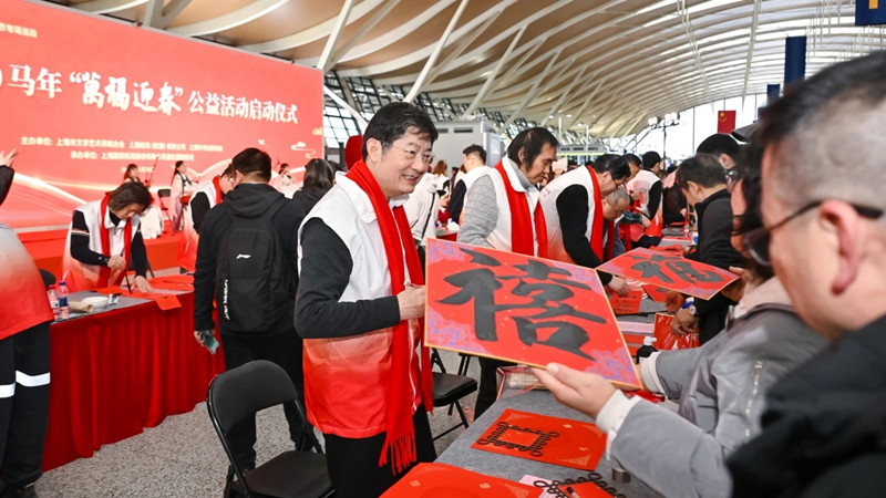 The 2026 Spring Festival public benefit event launched at Pudong Airport's Terminal 2 on Jan 20. Co-hosted by the Shanghai Federation of Literary and Art Circles, the Shanghai Calligraphers Association, and Shanghai Airport Authority (AVINEX), the event marks the start of the city's annual cultural activities.
