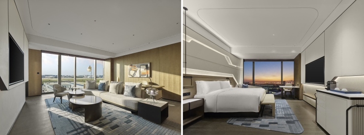 酒店拥有300间新颖舒适的时尚客房,配备全景落地玻璃窗,让旅客尽览虹桥机场航站楼、机坪以及飞机起降的美景。房内配有55/65寸高清智能电视、高速无线网络和高档洗浴用品,为旅客提供一流的舒适入住体验。