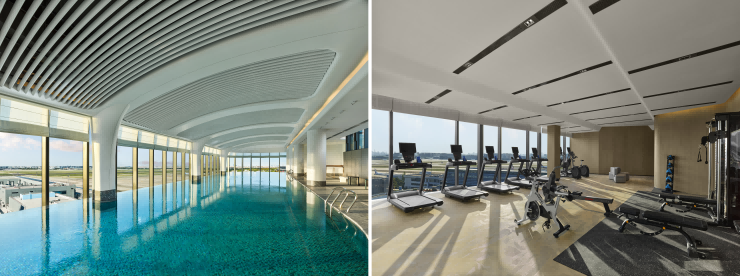 健身中心、泳池位于酒店9层,宽广的落地窗直面航空盛景,为宾客带来心旷神怡的运动体验。宾客可在无垠的视野中畅享水之悦动,开启活力满满的一天。