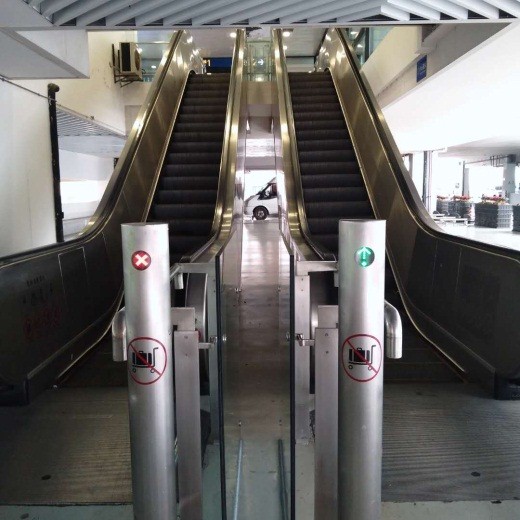 浦东机场P1停车场内共有垂直电梯12部,其中P1停车场西侧,即近T1航站楼一侧有垂直电梯3部(见图3);自动扶梯18部, 其中近T1航站楼一侧有15部,分布于四个楼层之间,每两个楼层之间均有4部下行自动扶梯(见图4),一二楼之间还有3台上行自动扶梯(见图5)。