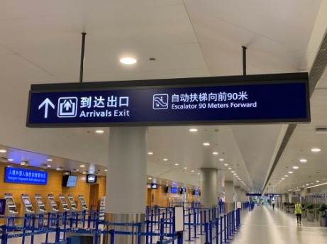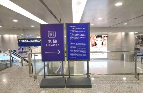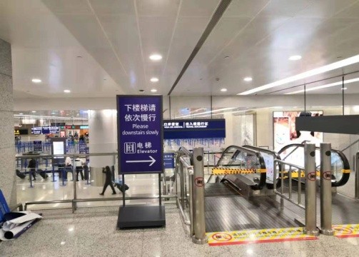 在浦东机场国际到达北侧区域的标识上设置了提示旅客自动扶梯的方位以及步行距离,对于将手提行李较重较多的北侧长廊到达旅客引导至南侧自动扶梯具有一定的分流引导作用。同时,由于考虑到单一标识可能在行走中被旅客忽略,导致旅客无法寻找到自动扶梯准确方位。7月28日,浦东机场在北侧停运自动扶梯两边又新增了标识,进一步提示临近的升降电梯方位,让有需求的北侧长廊到达旅客可以使用北侧电梯旁的厢式电梯。