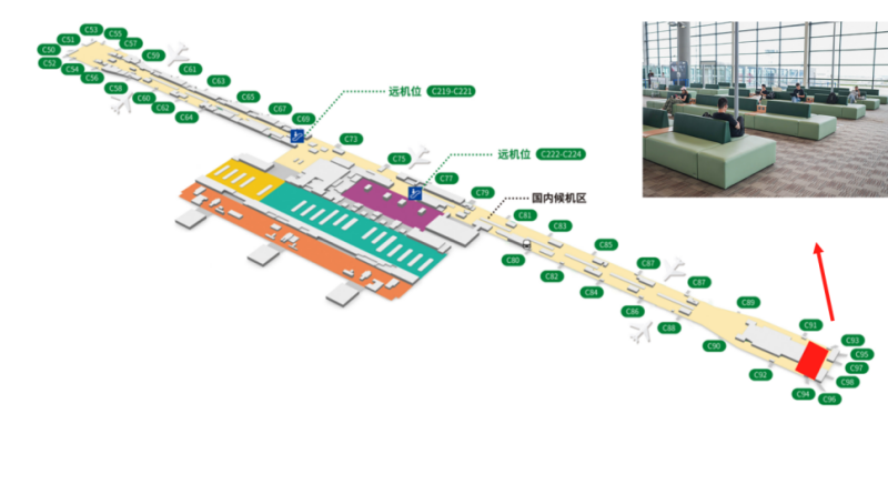 图1.T2国内混流C92登机口附近旅客休息区