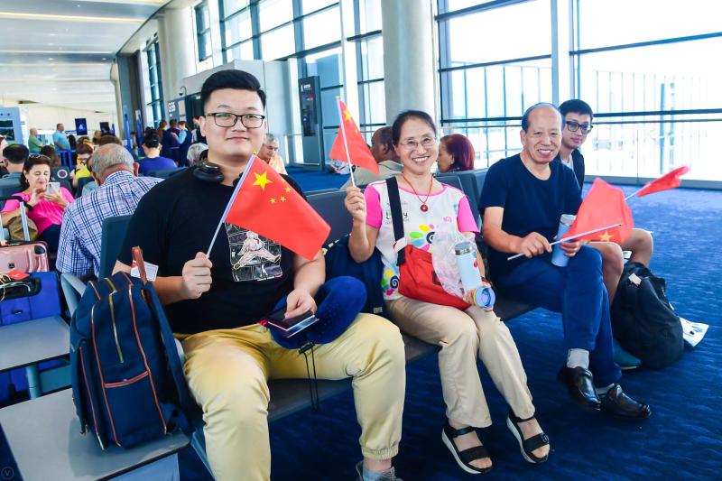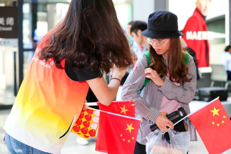 浦东机场举办的“带着国旗去旅行”启动仪式和现场志愿者派发小国旗。