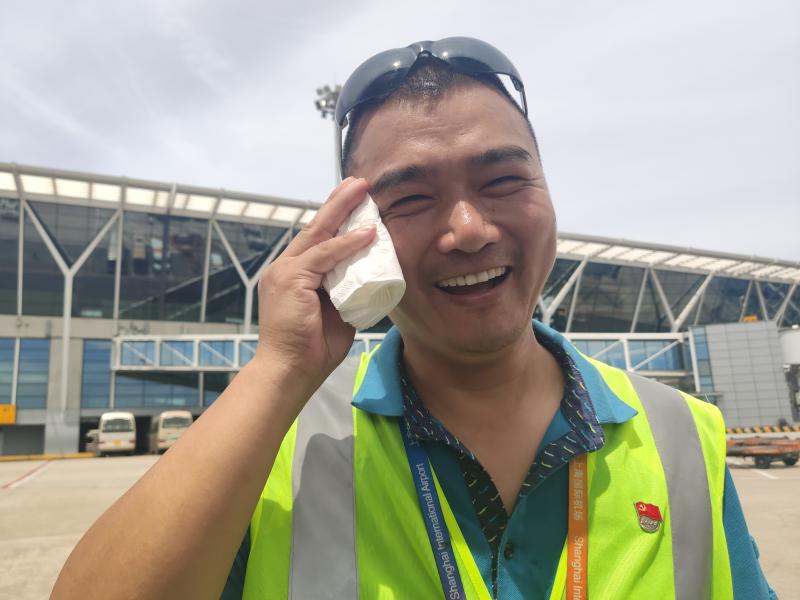 他背着手,迎着骄阳,笔直站立于飞机右侧机翼下方,全神贯注观察着航空器周边,严防无关人员、车辆接近。每日13时至15时是航班高峰,也恰是一天中最热时,飞机监护员们常要连续值守三、四个航班。汗,就任由它流吧,只要不遮挡视线。记者问他,可曾中暑过?李小龙说,没有!上海是干热,比家乡的湿热好多了。