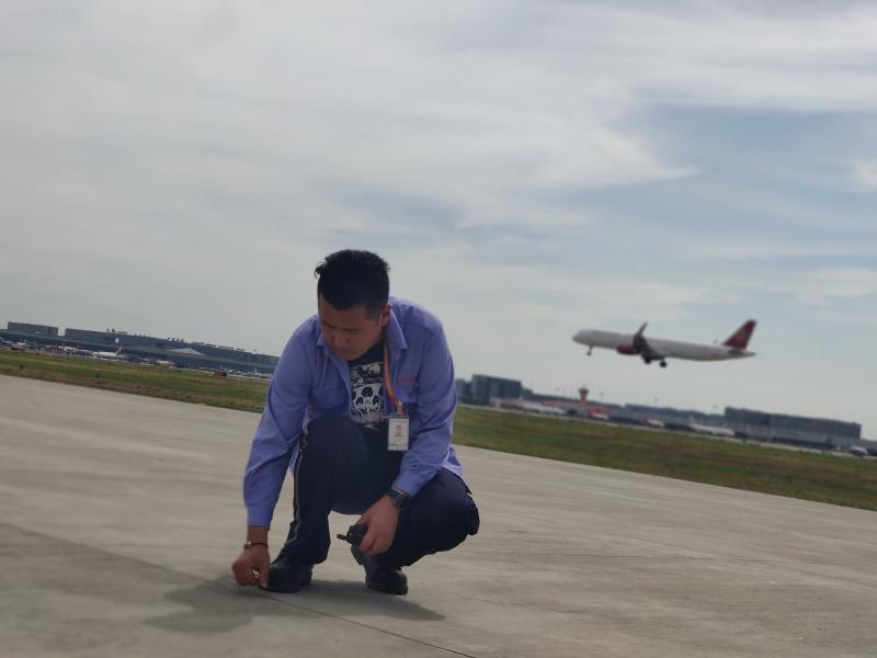 飞行区场务巡视员孙斌,就是找石子的人。趁航班间隙,他驾车对跑道进行检查,烈日下,他频频下车,俯身测量、探摸,清除任何不利航空器安全的机坪外来物。