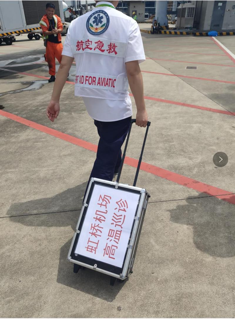 在上烤下蒸的机坪上,高温巡诊团医护人员关永志、唐倩,正为一名机坪工作人员测血压,脚下是配备齐全的高温巡诊箱。虹桥机场消防急救中心很贴心,专门建立了高温巡诊制度,明确35℃以上高温天,医护人员必须上、下午在机坪各巡诊1次,每次至少2小时以上,旨在给一线工作者更多安全感。