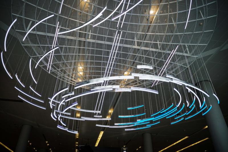 钢琴头顶,盘旋着上百条发光灯片。动态灯光与音乐节奏无缝融合,为旅客献上视觉与听觉双重饕餮,它白天纯净,夜间妩媚,将为你留下独特的上海机场记忆。