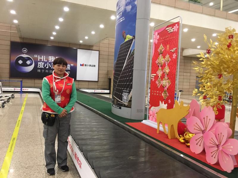 凌晨2时,行李大使李阿姨刚刚服务完FM9595航班的旅客行李整理工作。(李晔 摄)