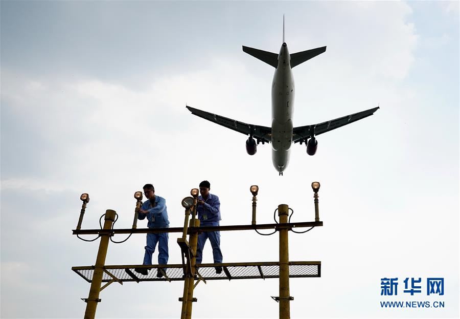 7月14日,上海虹桥机场飞行区管理部的员工冒着酷暑检修助航灯。