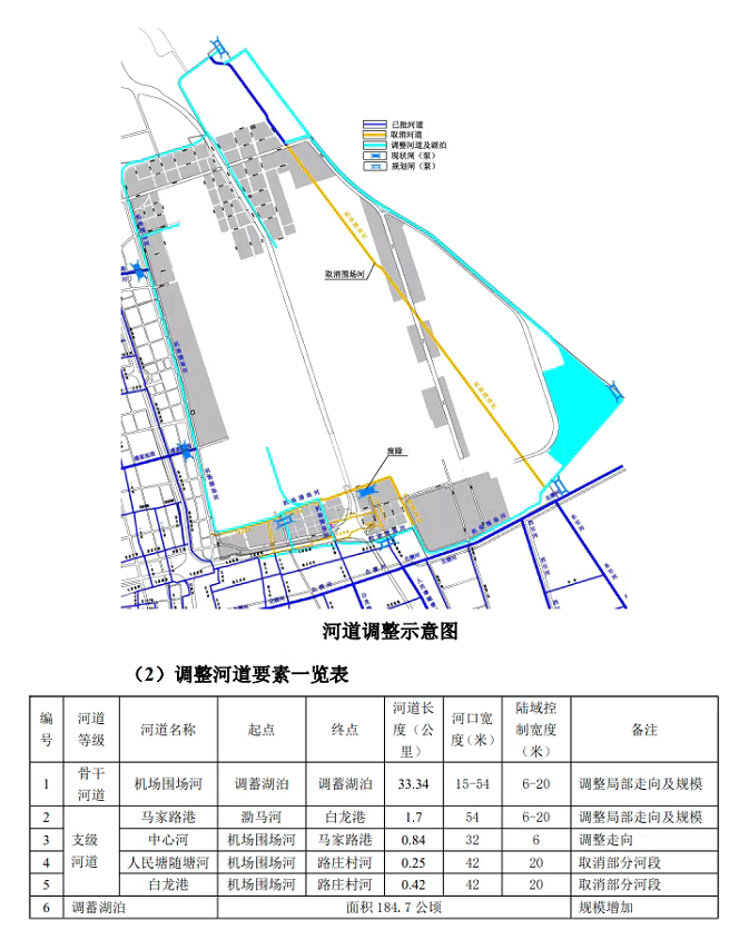 为满足机场最新 30 年一遇的排涝标准,同时兼顾机场四期建设的需求,机场集团拟对机场河及南部区域的河道蓝线进行调整。