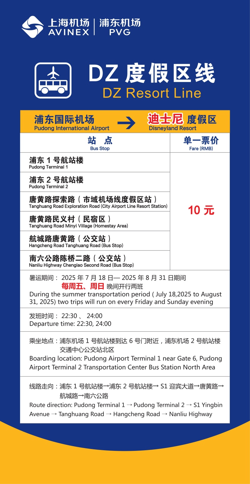 自7月18日至8月31日,每逢周五和周日新增空港巴士DZ度假区线班次:22:30 和 24:00 发车。停靠:浦东T1航站楼、浦东T2航站楼、度假区站、民宿区、航城路唐黄路站,终点站为南六公路陈桥二路站。