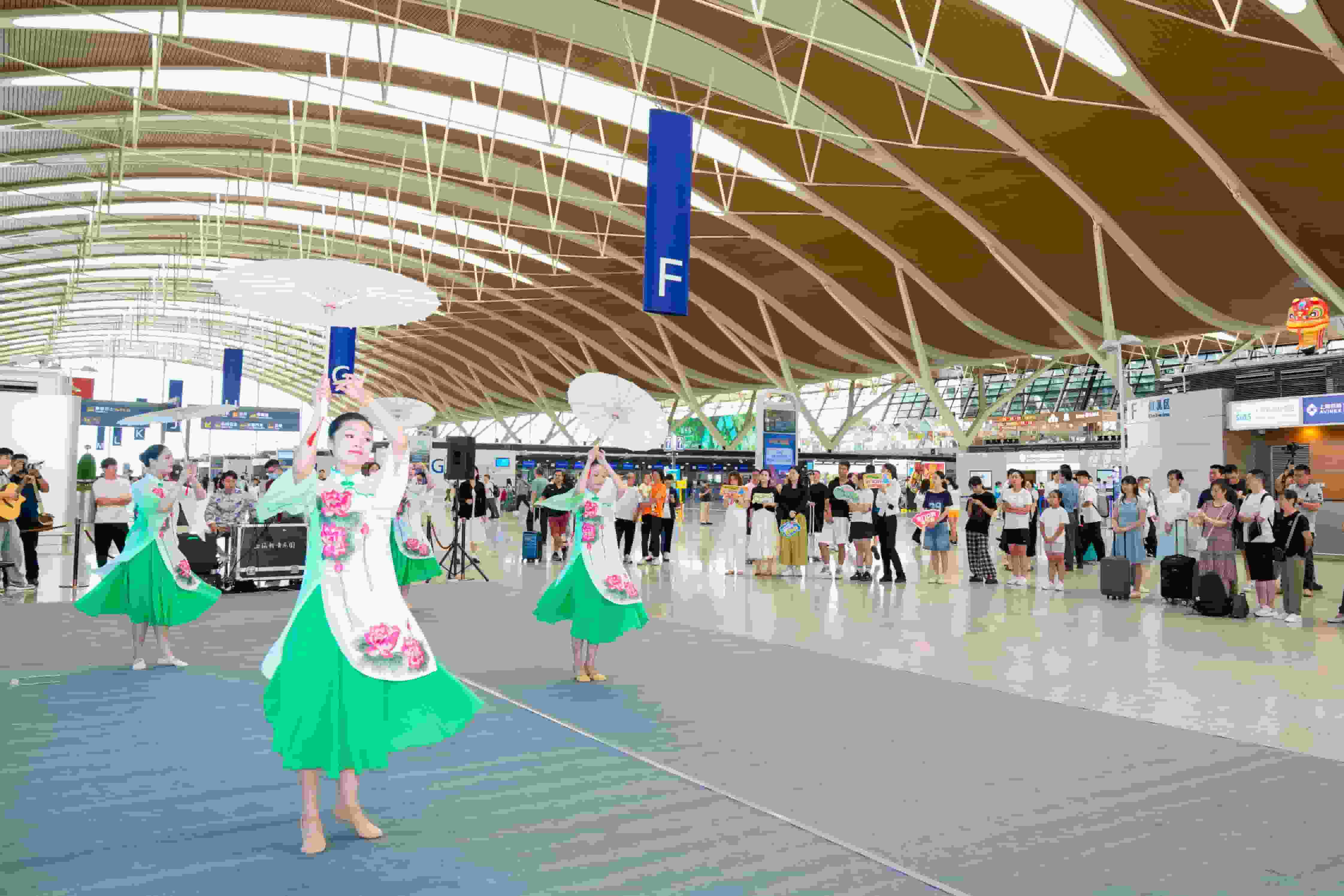 浦东、虹桥两场结合“中国样·China Young”上海机场人文品牌打造,联合上海轻音乐团、春天少年合唱团、上海马戏团等艺术团体以及驻楼单位员工,围绕弘扬红色文化、海派文化、江南文化,分别推出 “快乐一夏,‘暑’不尽的美好” “这YOUNG的夏天,轻音漫时光”系列旅客互动活动,向中外旅客表演传统戏曲、歌曲演唱、中西乐器演奏、非遗木偶剧、杂技等精彩节目。8月29日恰逢中国传统节日七夕节,浦东机场工作人员们换上汉服,向旅客赠送节日定制小礼物,把来自上海机场的问候带回家。